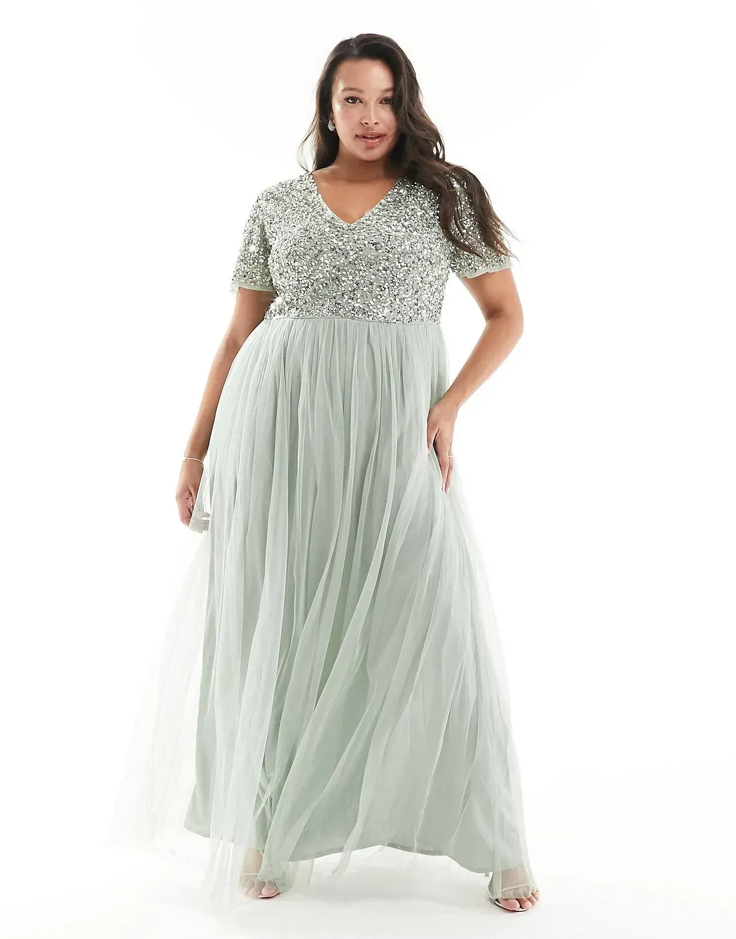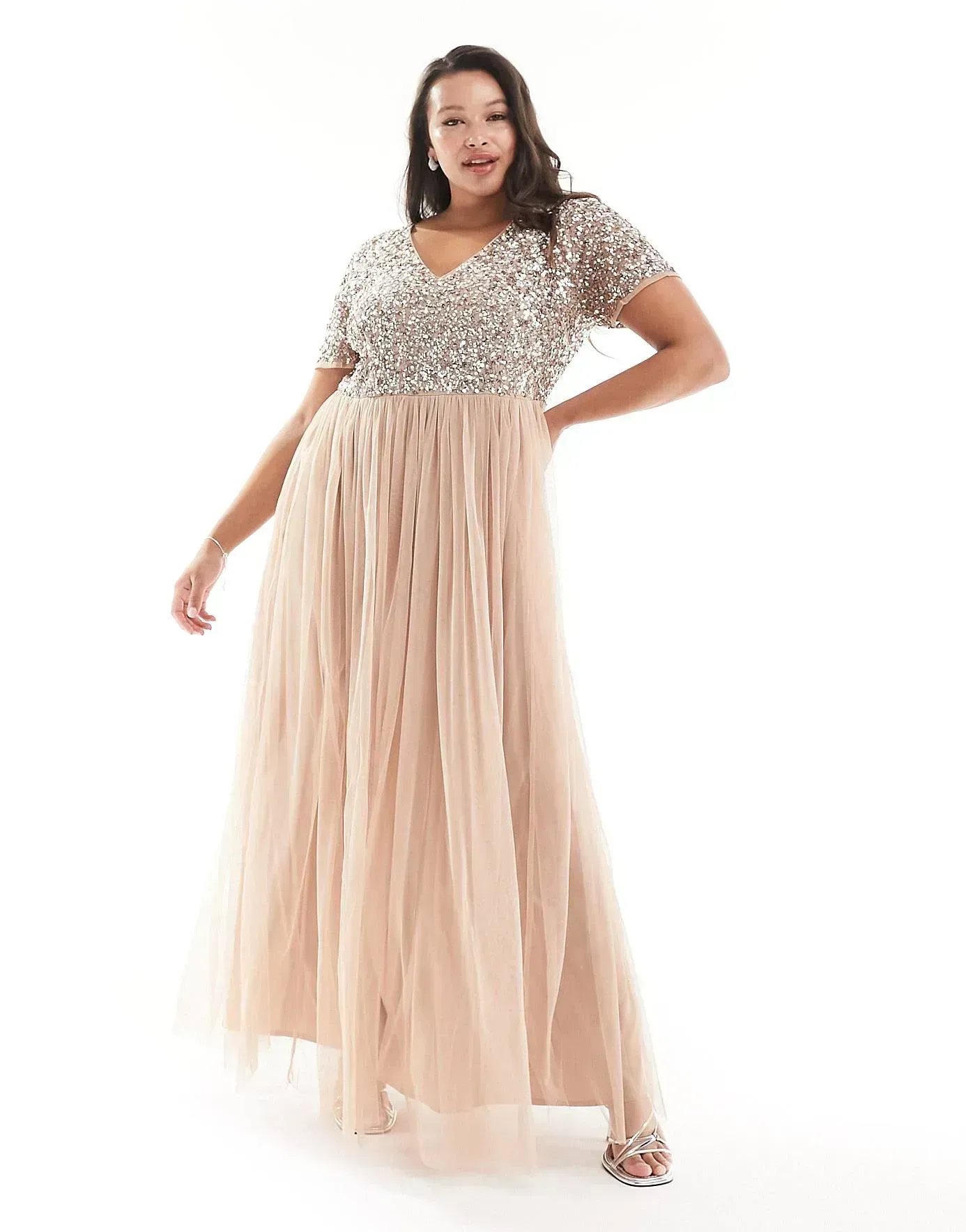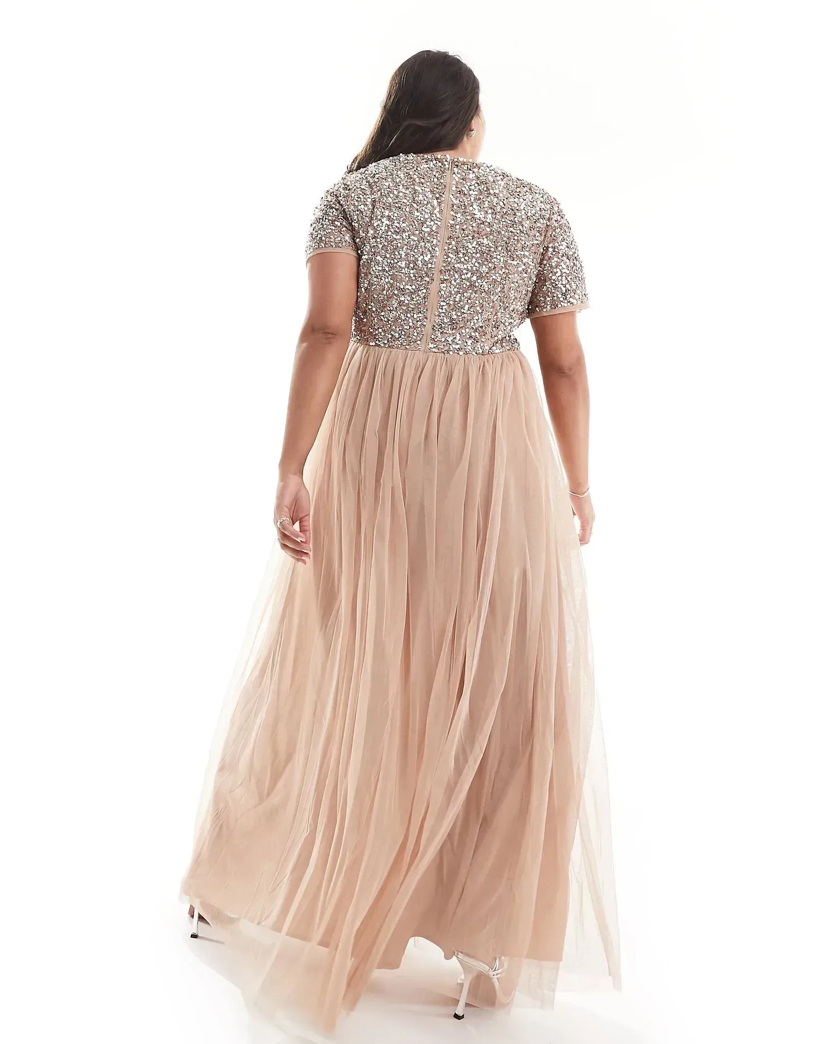 Maya plus bridesmaid short sleeve maxi tulle dress with tonal delicate sequins in muted blush